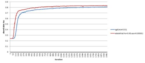 はじめに 勉強会で、学習率を改善(自動調整)する事で学習時間を短縮し、ファンタジスタドールを見る時間を多く確保できる事が示されていた。 AdaGrad等をさらに改良したらしいAdaDeltaがあるようなので、ロジスティック回帰に適用してみた。 AdaDeltaとは M.…